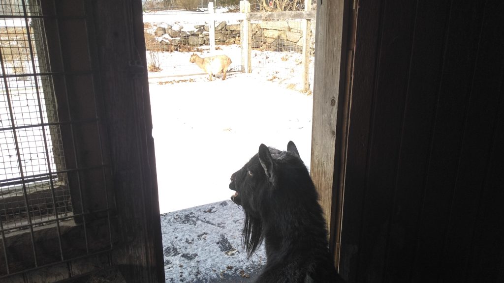 Goats hate rain, it’s like they’ll melt or something! Their coats don’t shed rain like horses’ do (at least up to a point), so it’s understandable. But they won’t go out even if the ground is just wet! If I open their pen door, they look at me like “You’ve got to be kidding, we’ll melt out there!”