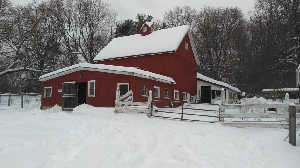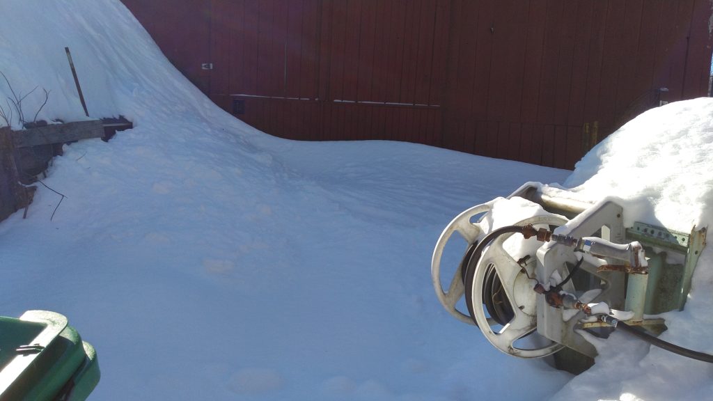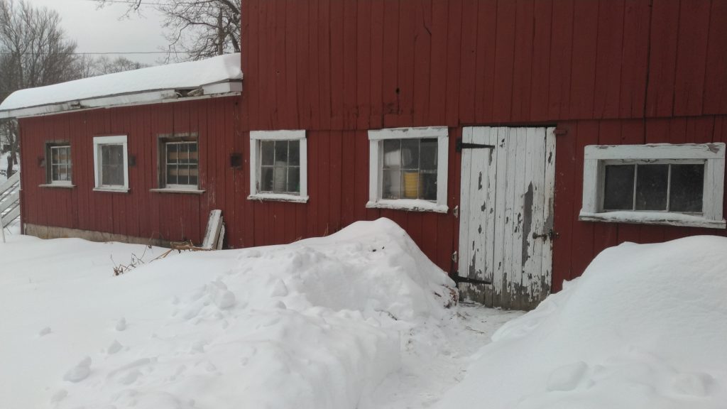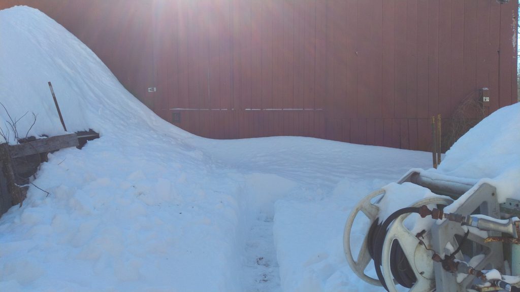 - The barn has a nice metal roof. The nice part is that when the sun hits it, all the snow avalanches off. The not-so-nice part is that it lands right in front of the door – which then needs to be dug out.