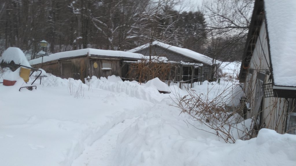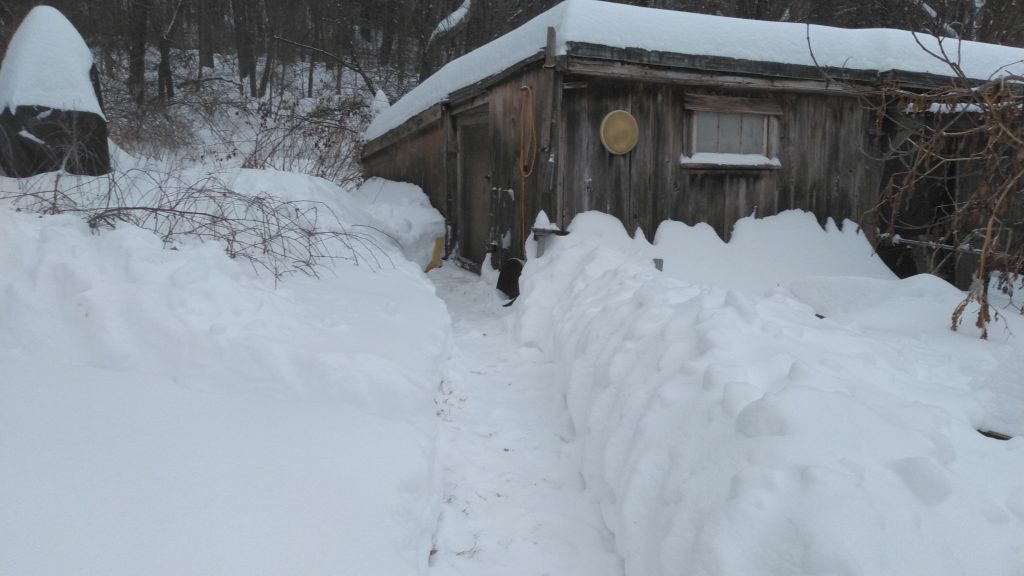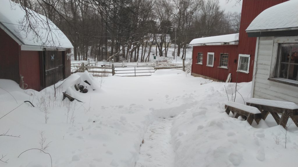 Even with paths dug out, getting feed and water to all the animals is tough (there’s no running water in the barn or coops). And with this cold, handling water is, well, “fun” and “pleasant” on bare skin when you have to take your gloves off to open waterers or attach temporary hoses.