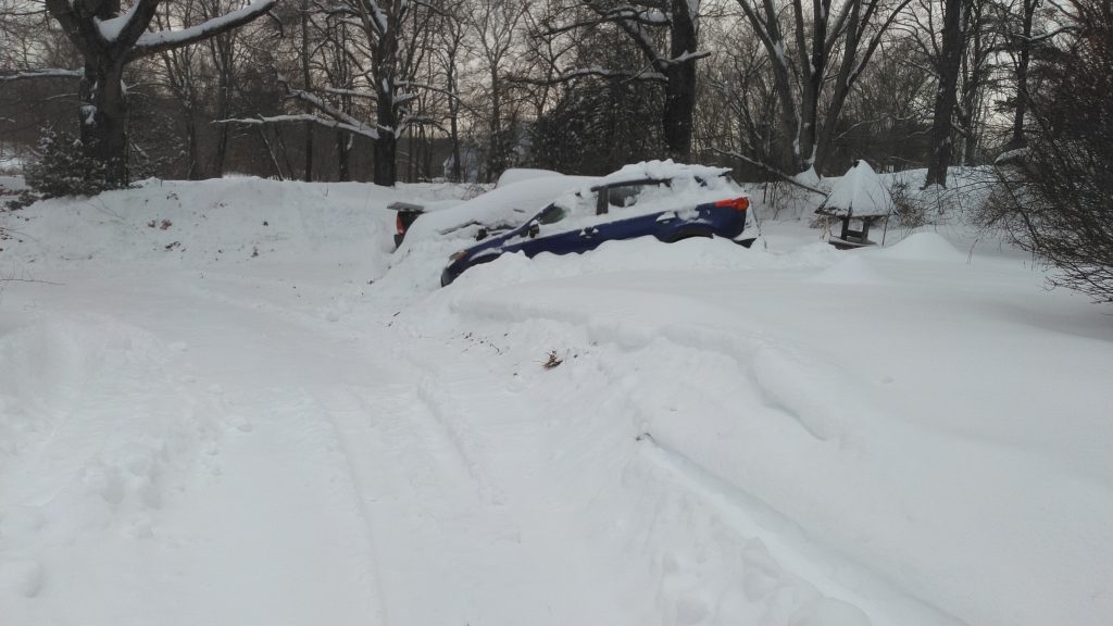- We don’t have a garage, so the cars are parked outdoors, neatly side-by-side. But with that much snow, they become one giant snow mound. I finally dug out the blue Rav4, but the Prius and Tacoma are still entombed.