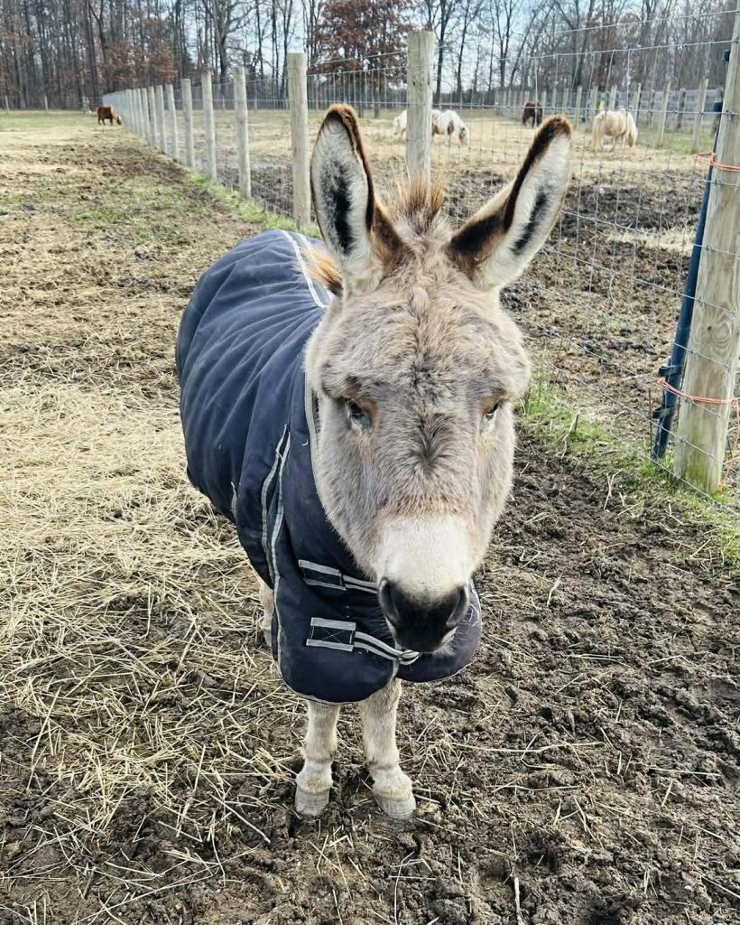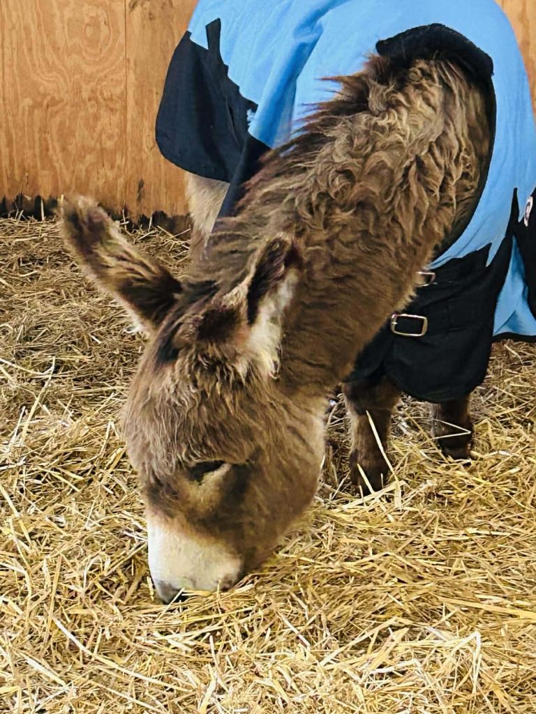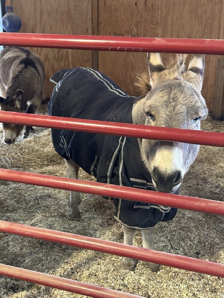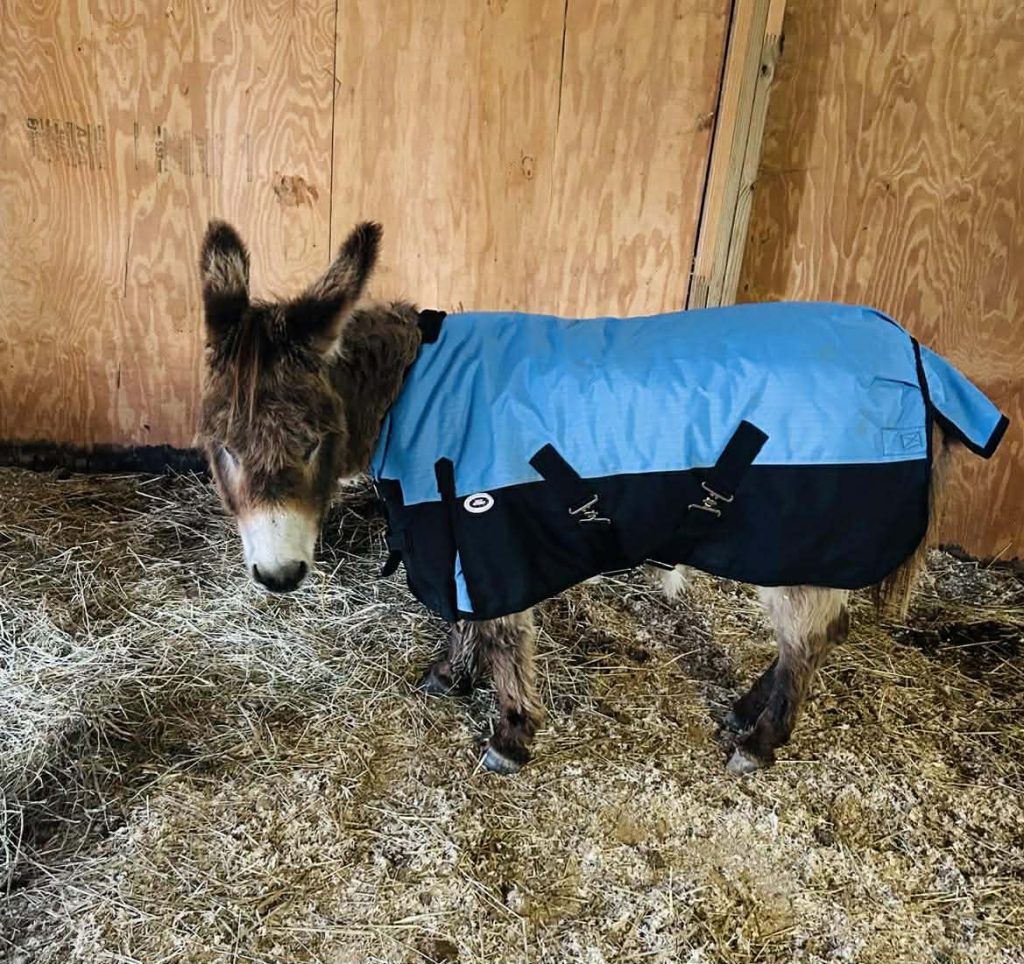 Although related to horses, donkeys lack the thick coat that their horse cousins have. They also have those “fluff muscles”, but because their coats are thinner, it’s not as effective. They don’t shed water in the rain, and can’t naturally insulate against the snow. By instinct, donkeys typically seek shelter in rain and snow, a hint to their donkey parents that they can’t be “naked” in the winter like many of their horse relatives.