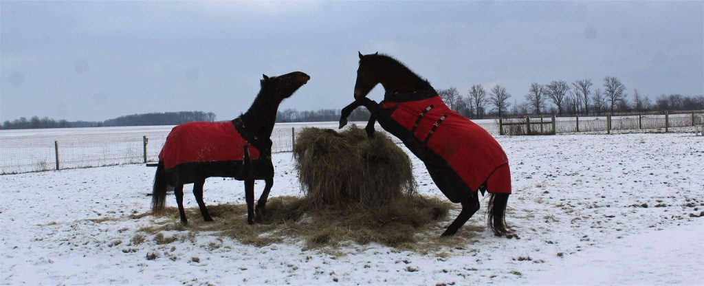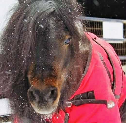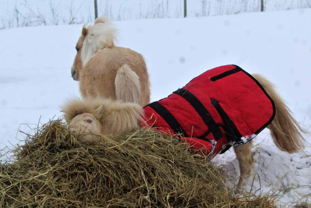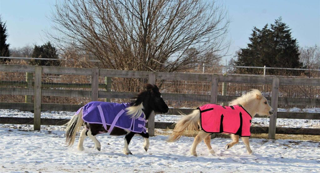 Out there in the frosty pasture, with coats fluffed and snow balanced on their backs, my horses say “no blankies please.” For now. But they do have one each in storage… just in case!