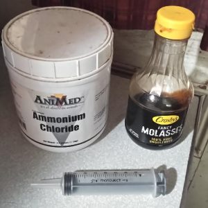 Male goats, especially dwarf breeds, wethers, and show goats, are prone to urinary crystals. These can form into urinary calculi (stones) which can block the urethra and lead to a fatal condition. You can read the article here. Ammonium chloride mixed with water and molasses and syringed into your goat once a day for five days per month is the first-line defense to help prevent and/or alleviate this condition. You can get these supplies using the buttons below.Purchase Ammonium Chloride HerePurchase 35ml Syringes Here